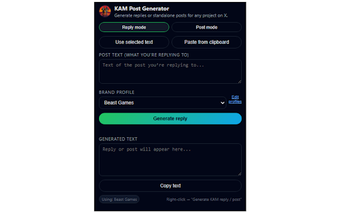 KAM Post Generator is a free Chrome add-on designed to streamline the process of creating tailored posts and replies for X. This tool allows users to generate content that aligns with their brand by utilizing customizable profiles, which can enhance engagement and consistency in messaging. It simplifies the content generation process, making it accessible to users aiming for a strong online presence.